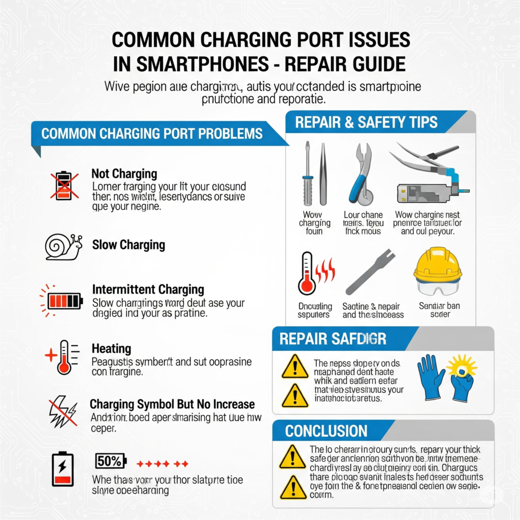“Fix common charging port issues in smartphones like slow charging, heating, not charging, and intermittent connection. Step-by-step repair guide for technicians.