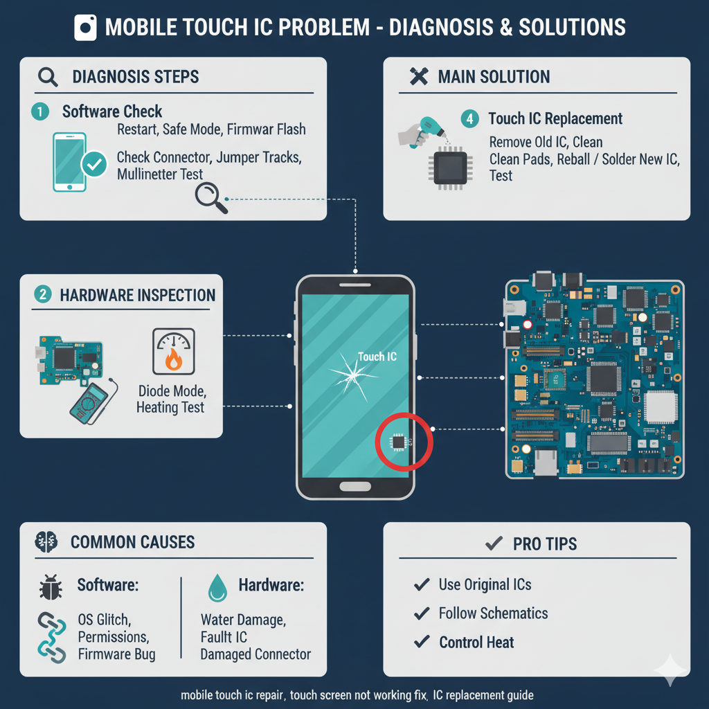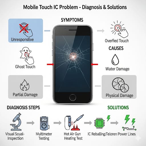 “Facing touch not working or ghost touch issues? Learn expert diagnosis and solutions for mobile Touch IC problems. Step-by-step guide for technicians to repair Touch IC faults effectively.”