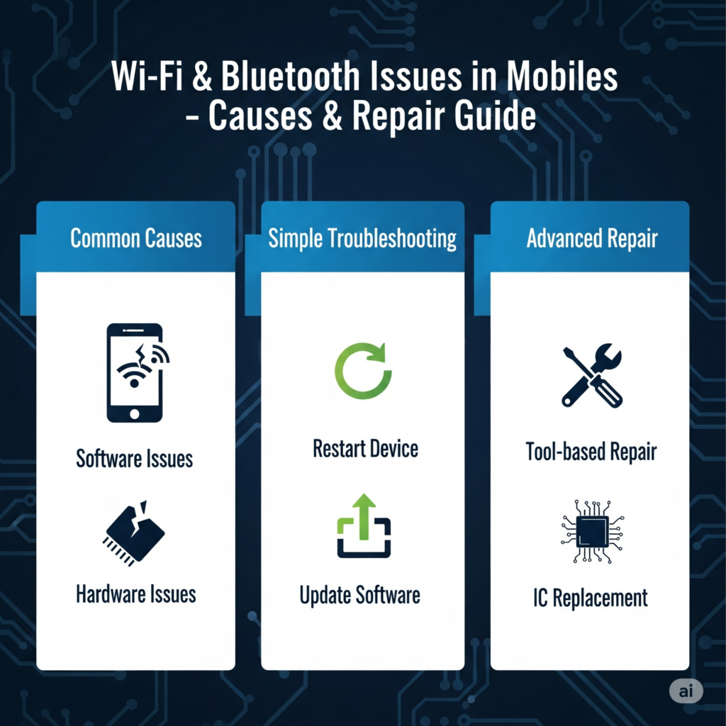 “Fix common Wi-Fi and Bluetooth issues in smartphones. Learn causes, step-by-step diagnosis, and repair solutions for technicians.”