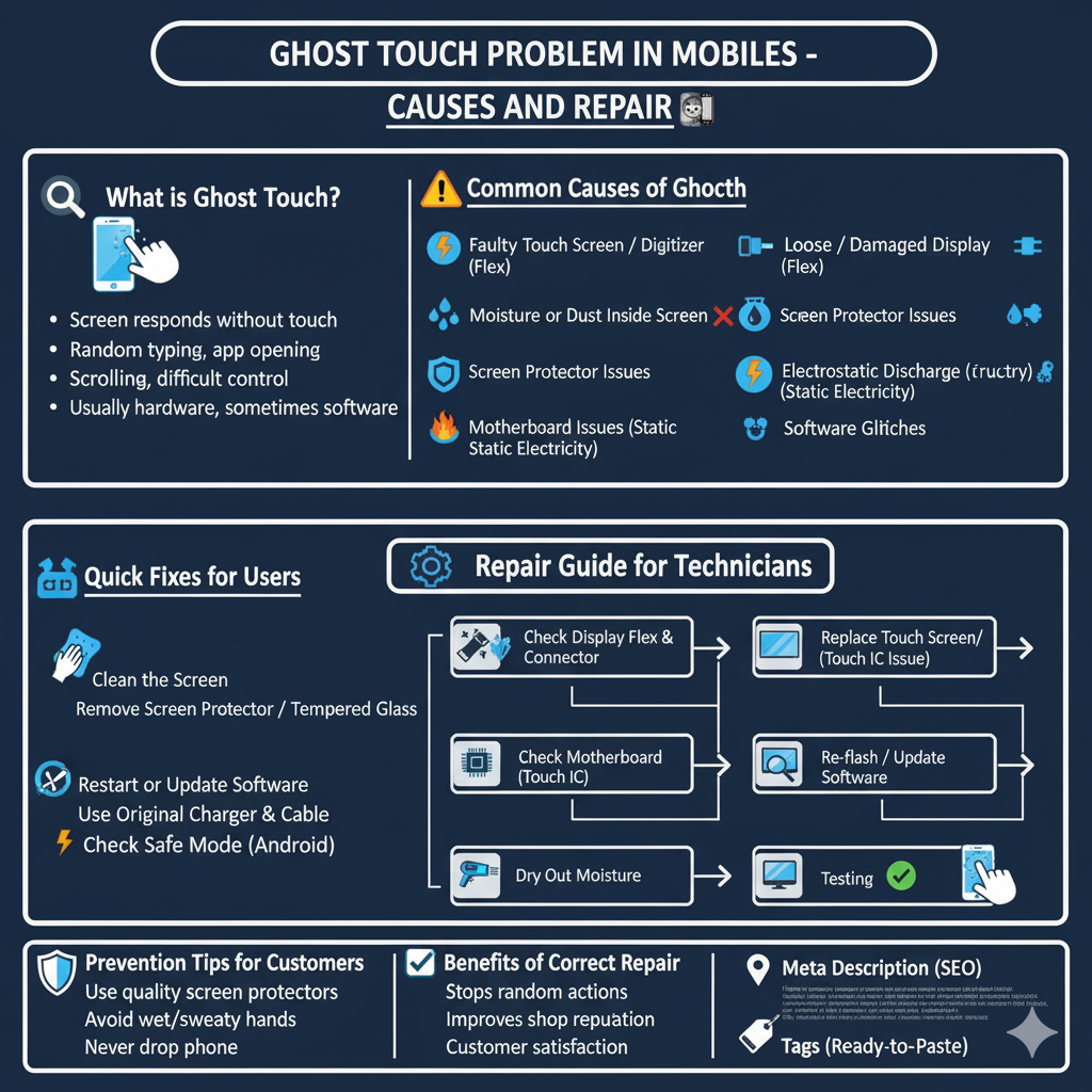 Ghost Touch Problem in Mobiles – Causes and Repair explained. Learn why your phone screen touches itself and how to fix ghost touch with easy steps for users and technicians.