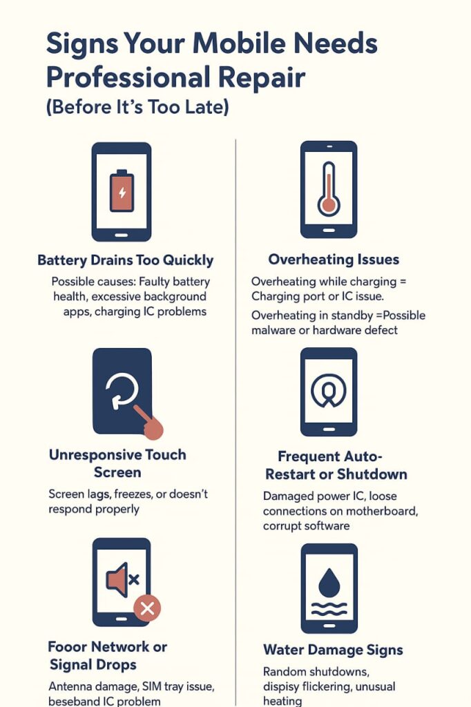 signs your phone needs repair, when to repair smartphone, mobile repair warning signs, mobile phone problems and solutions, phone overheating repair, fast battery drain fix, mobile charging issues, network signal drop repair